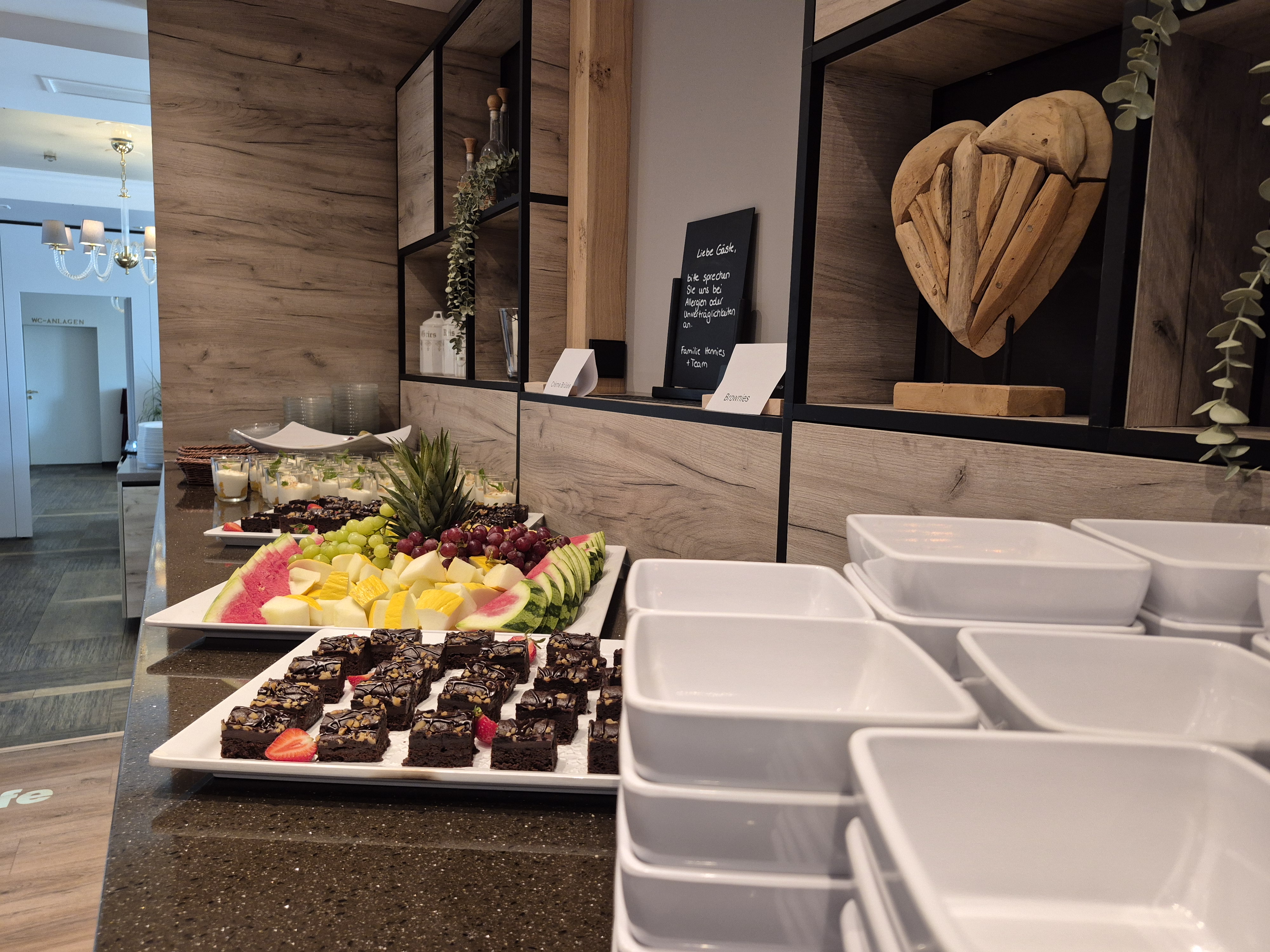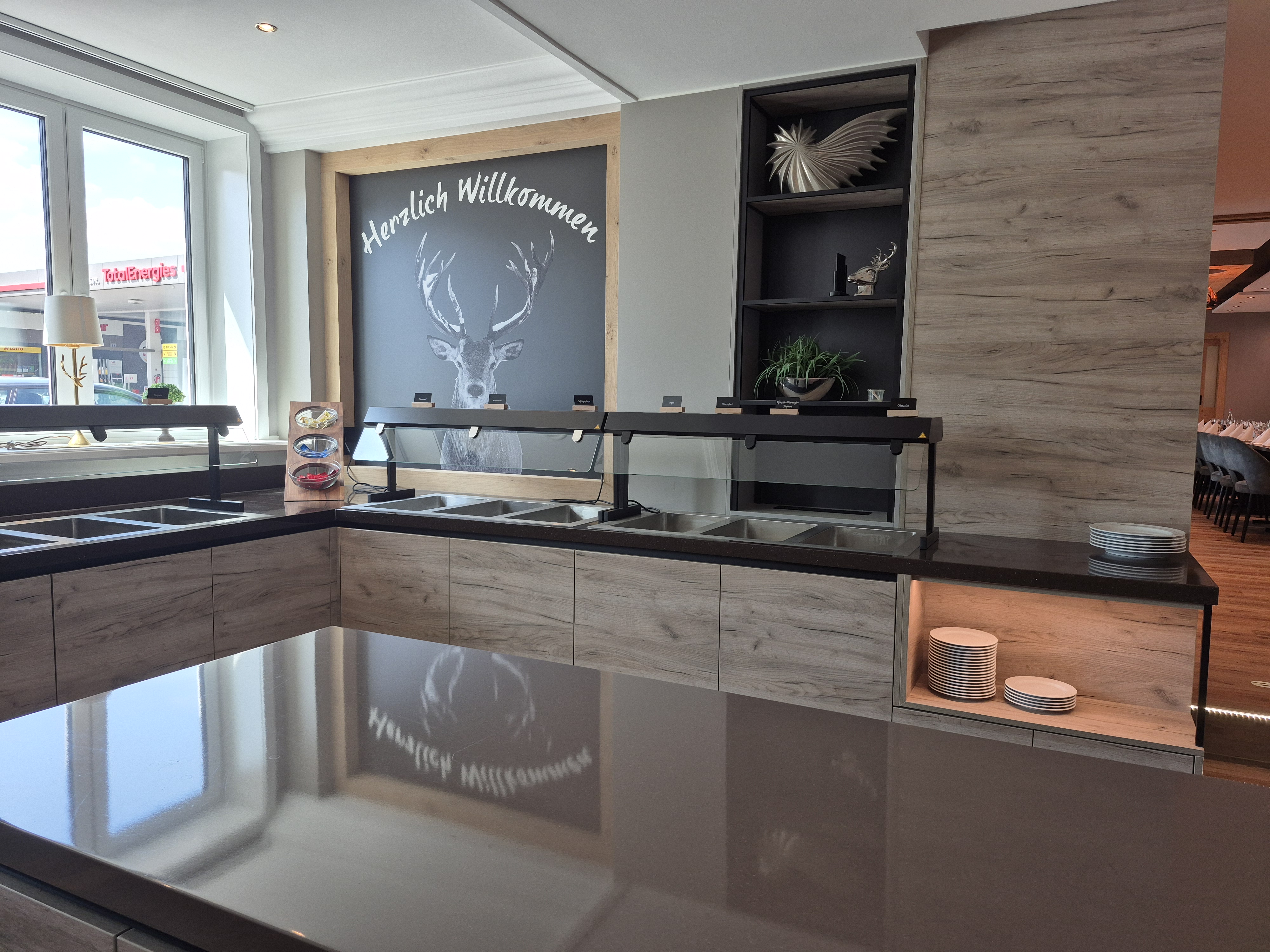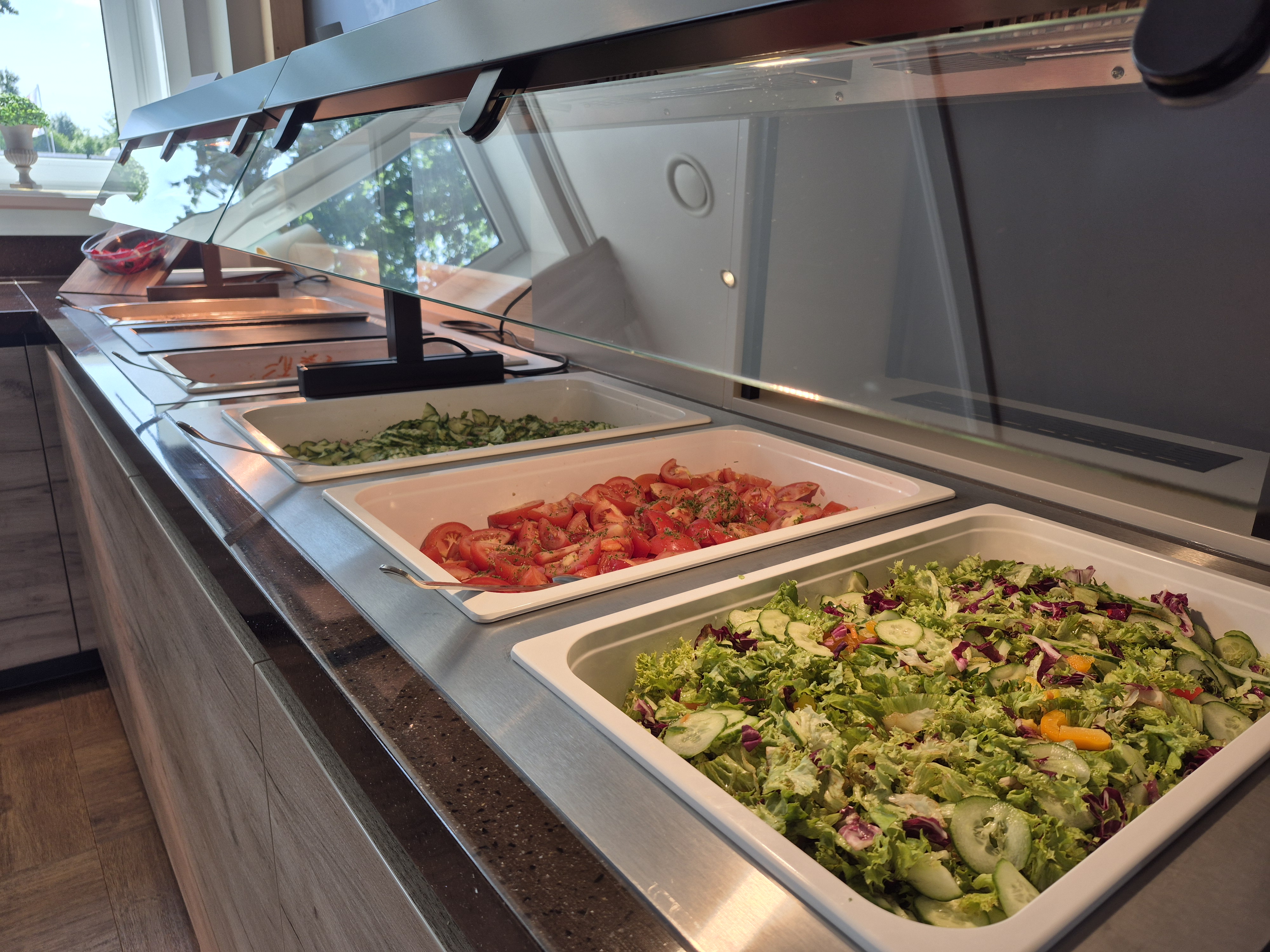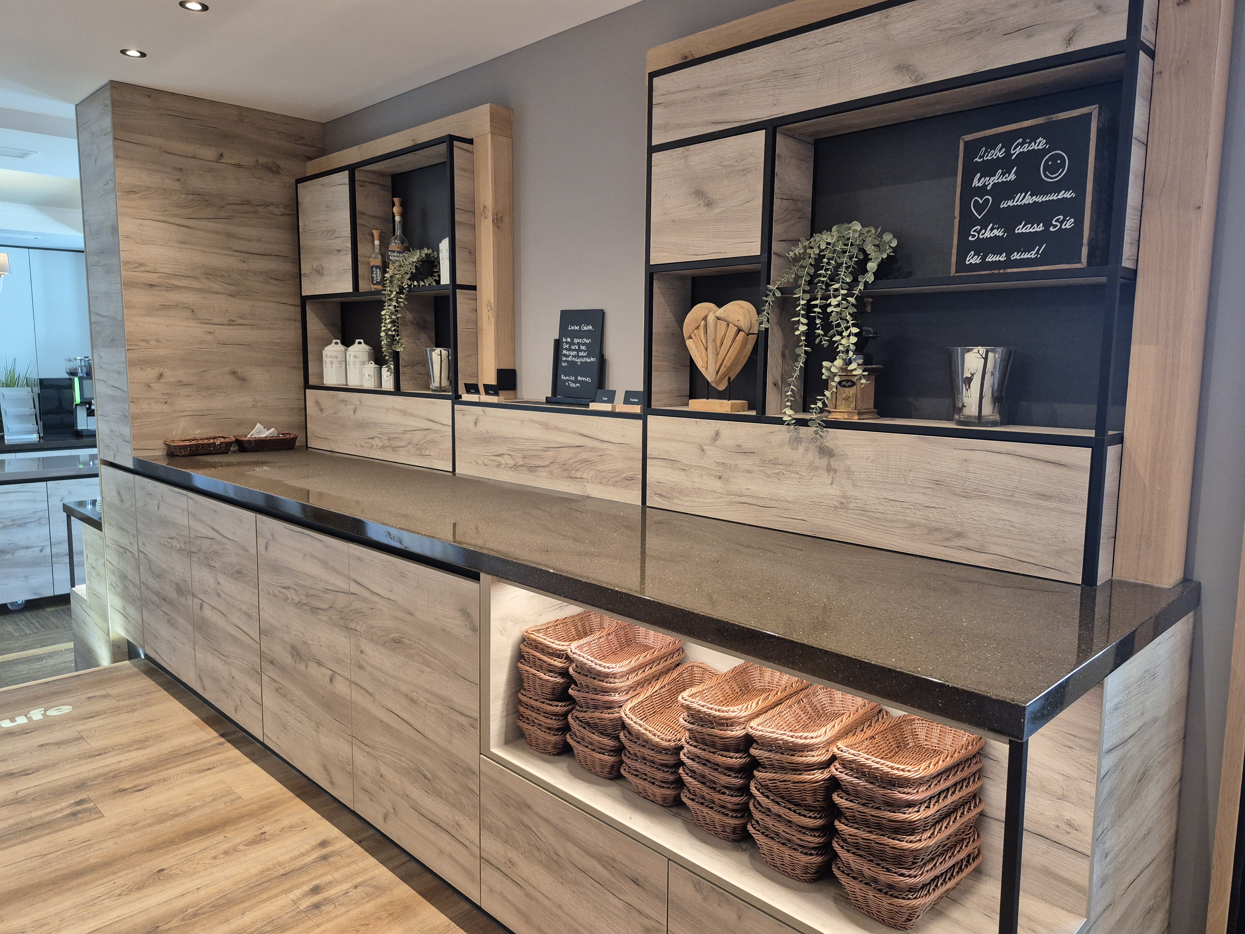 Besonderes Highlight der neuen Buffetlösung: die unsichtbar integrierte Kaltplatte GN 1/1 (Typ CK/330/CNS) von Scholl. Diese ist flächenbündig in die Buffetfläche eingebaut und sorgt dafür, dass empfindliche Lebensmittel wie Aufschnitt, Käse oder Fisch direkt auf der Oberfläche kühl bleiben – ganz ohne sichtbare Technik. So bleibt die edle Holzoptik der Buffetplatte erhalten, während die Kühlleistung zuverlässig für Frische sorgt.