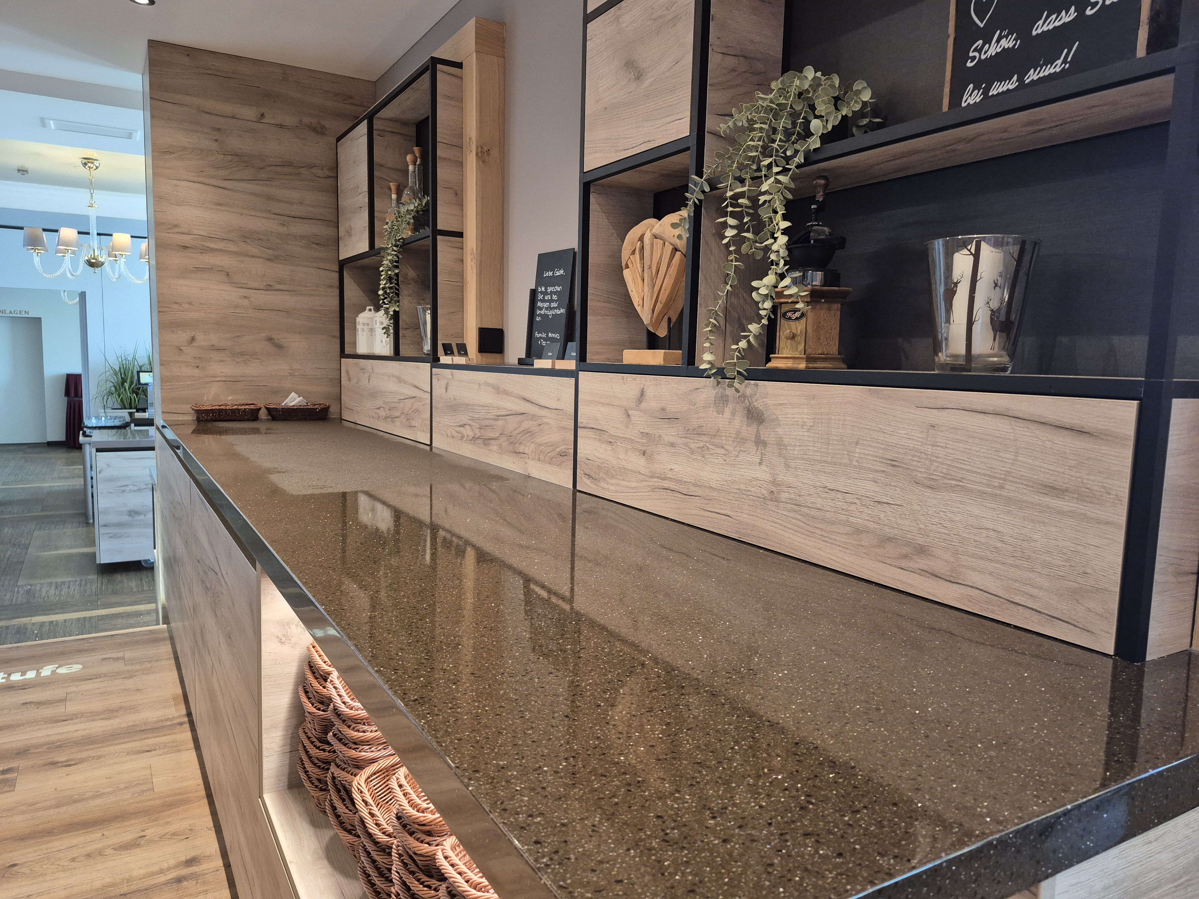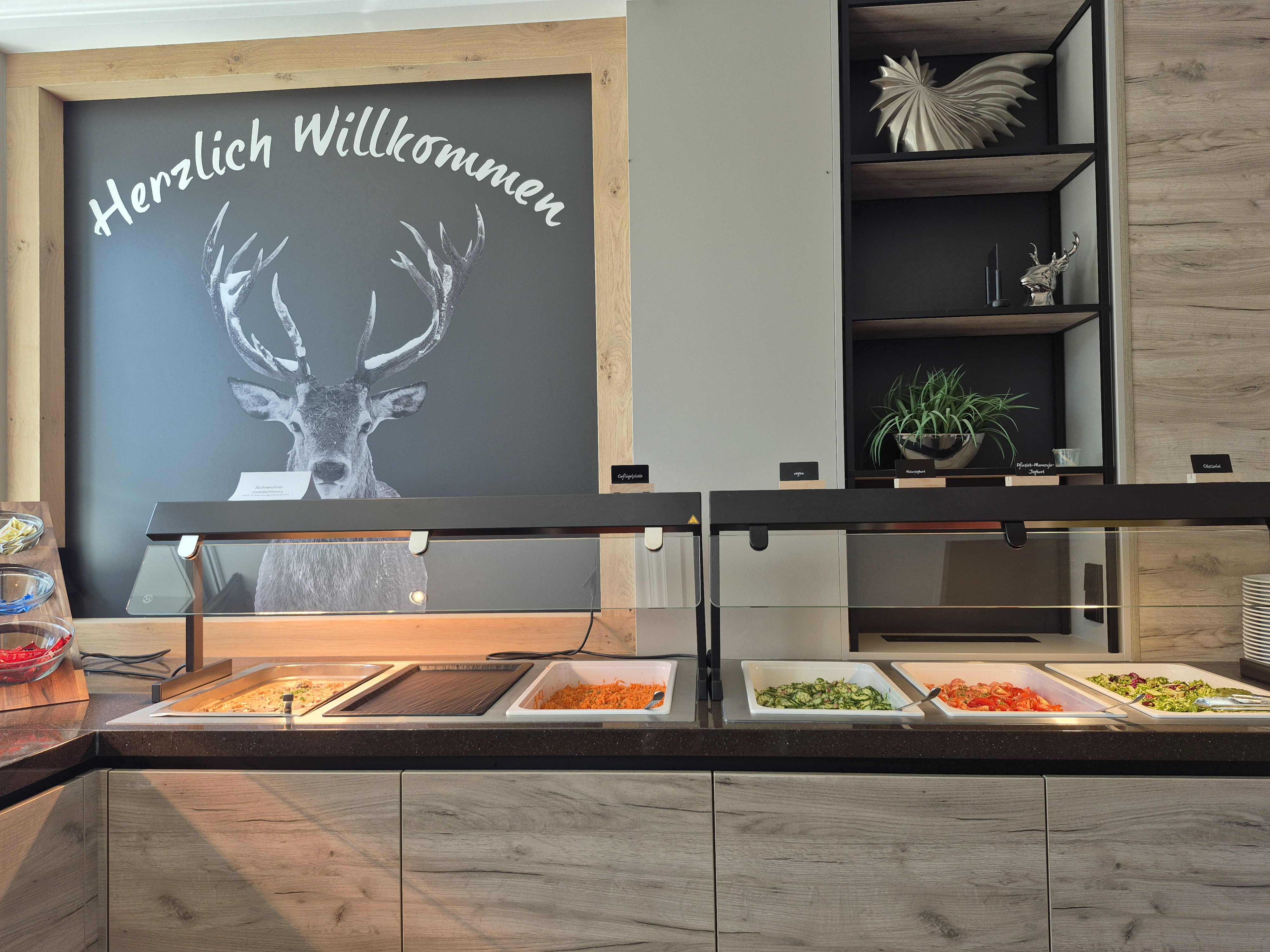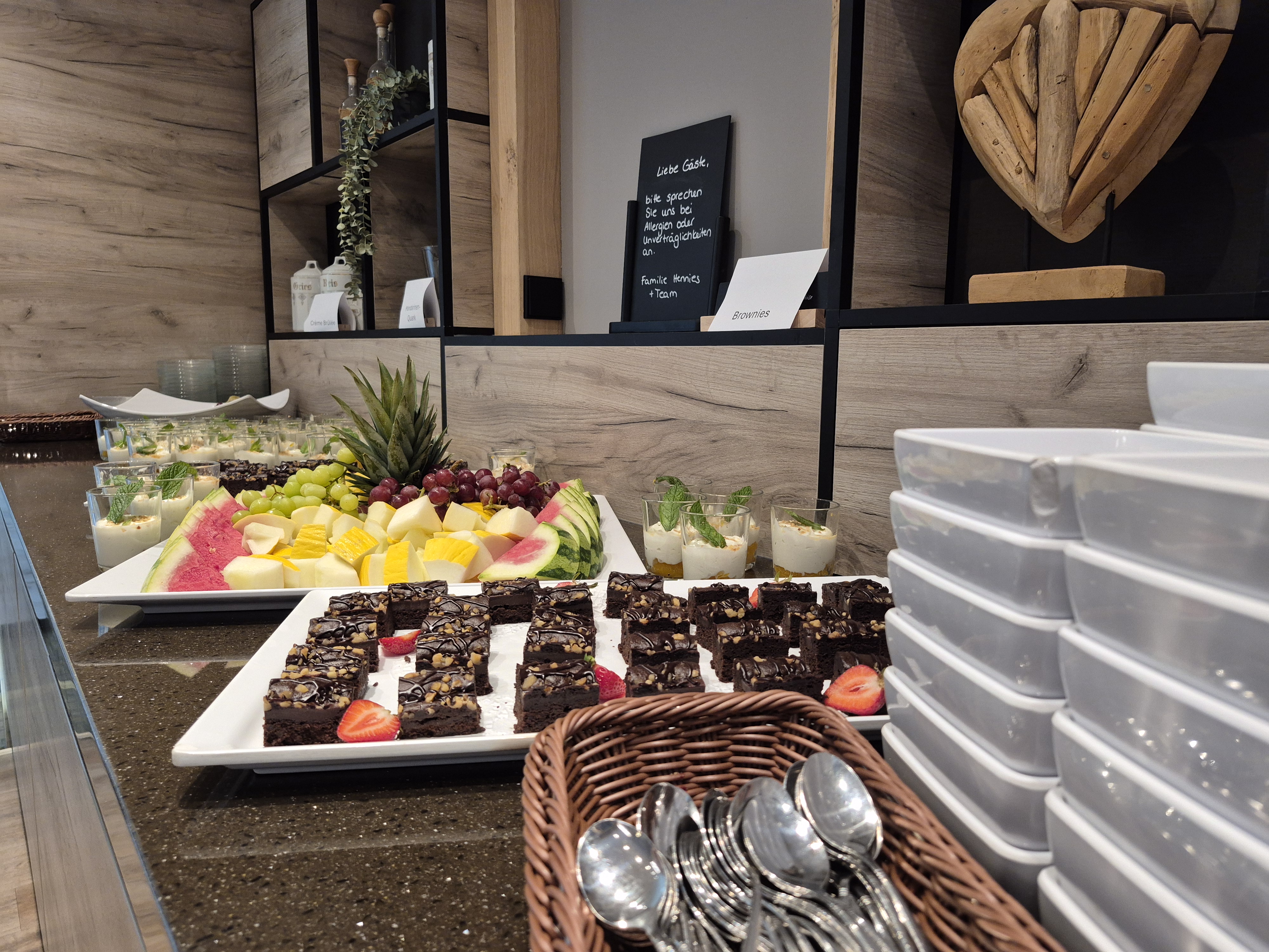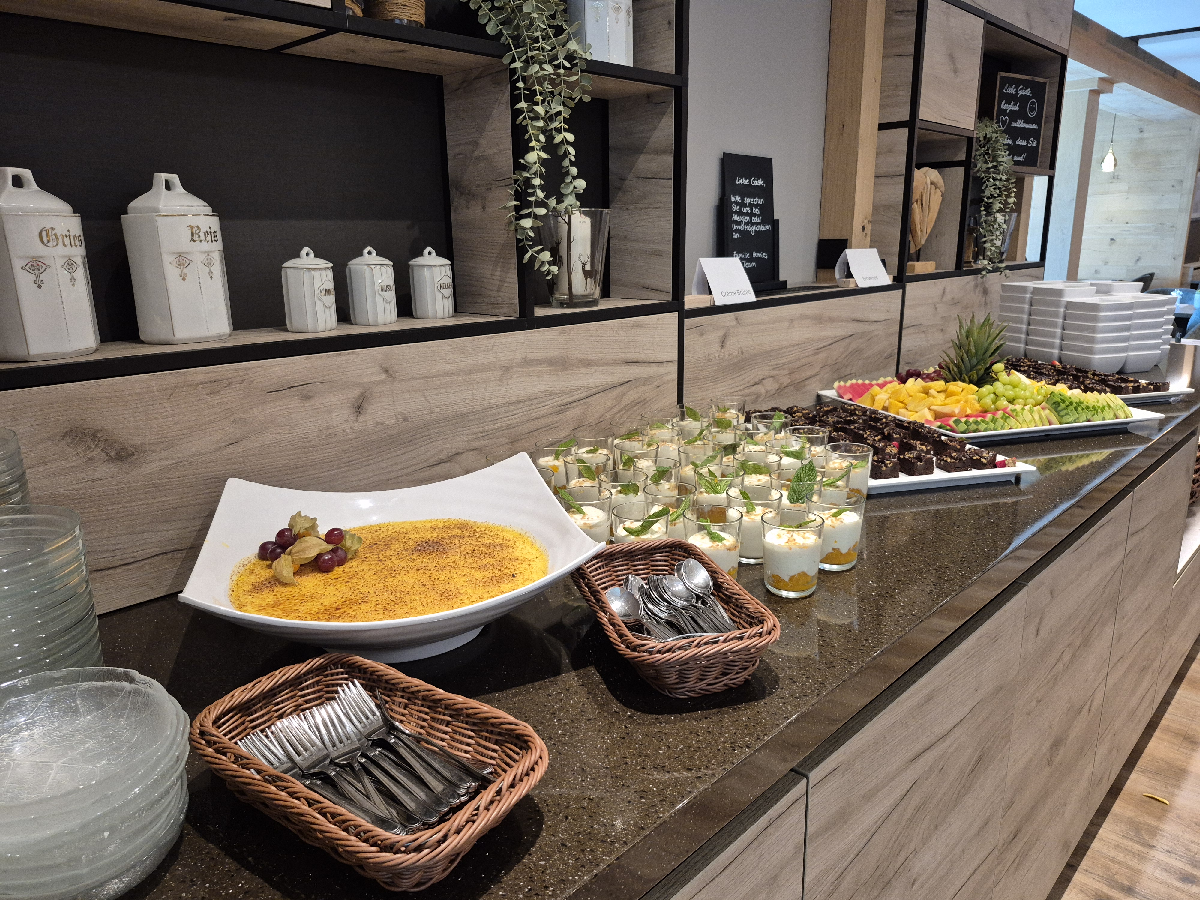 Besonderes Highlight der neuen Buffetlösung: die unsichtbar integrierte Kaltplatte GN 1/1 (Typ CK/330/CNS) von Scholl. Diese ist flächenbündig in die Buffetfläche eingebaut und sorgt dafür, dass empfindliche Lebensmittel wie Aufschnitt, Käse oder Fisch direkt auf der Oberfläche kühl bleiben – ganz ohne sichtbare Technik. So bleibt die edle Holzoptik der Buffetplatte erhalten, während die Kühlleistung zuverlässig für Frische sorgt.